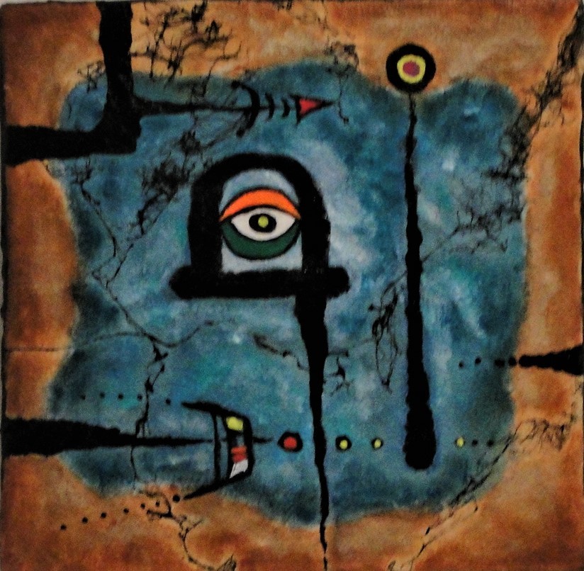 Acrylic and mixed media, 11x11 stamped metal clg. tile attached to a 1"thick wood frame, with fabric glued to surface of the metal tile, giving the appearance of a 3D piece.