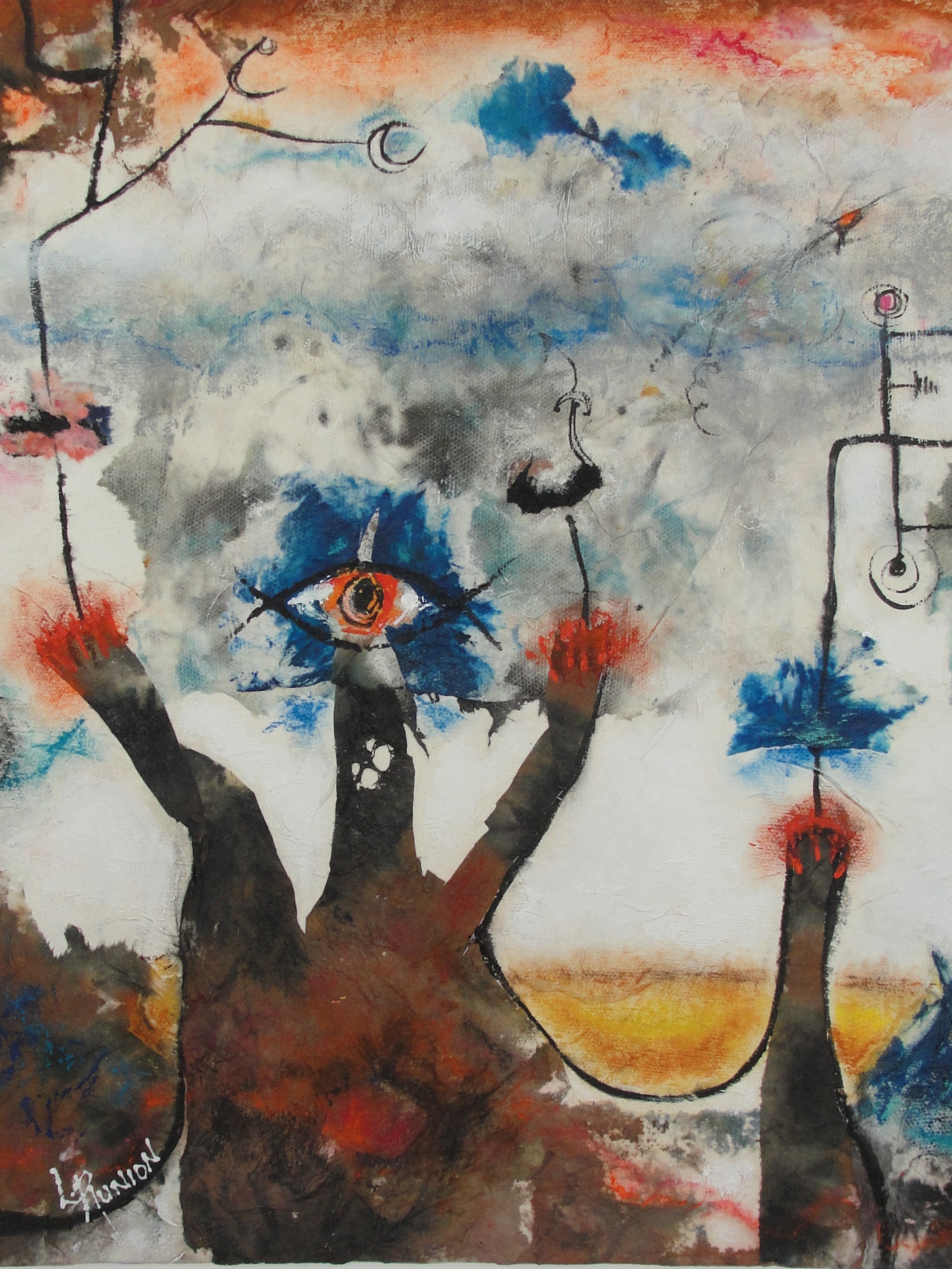 Acrylic and mixed media on canvas panel. Framed, size 19"x23", image size 16"x20", ready to hang.