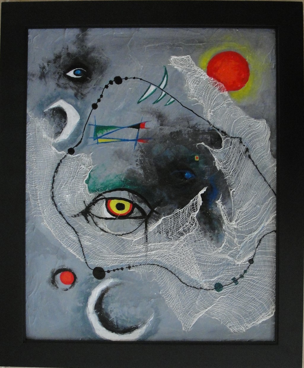 Acrylic and mixed media, cheesecloth, framed outside diminsions 23x19, image size 20x16.