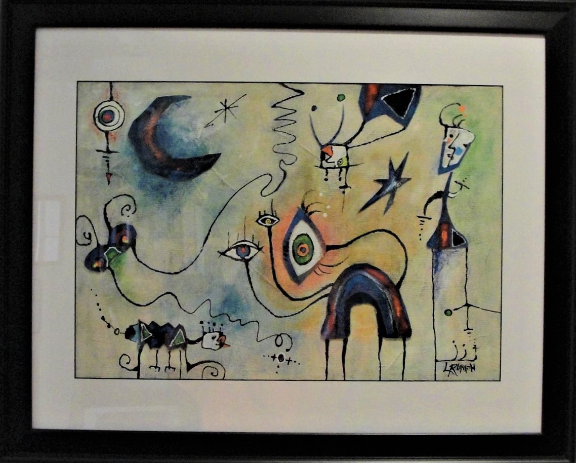 Acrylic and mixed media, on cheese cloth, image size 23x16, framed, matted and under glass,outside dimensions 29.5 x 22.5