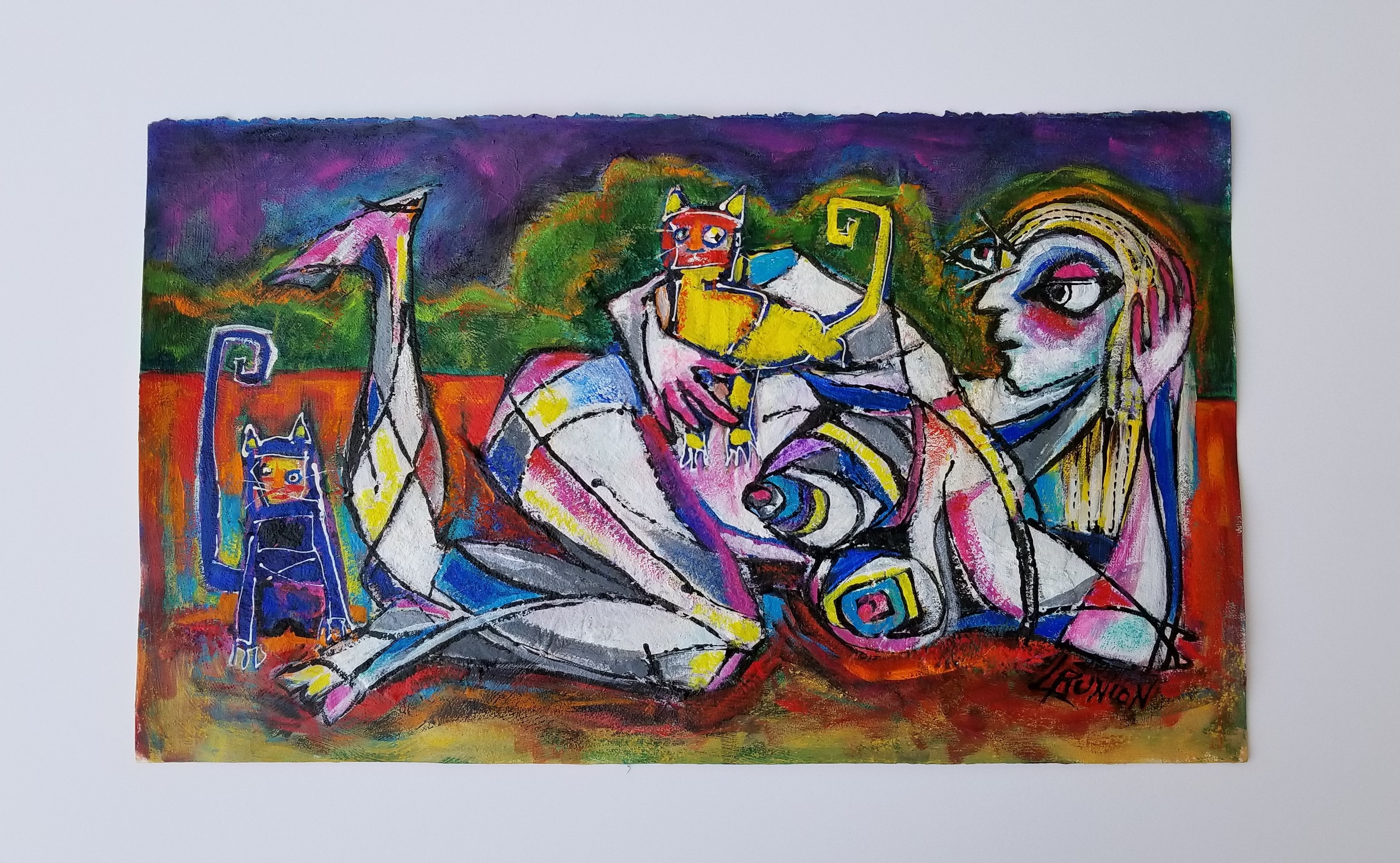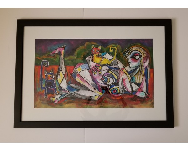Acrylic and mixed media on watercolor paper, matted and framed. Frame 38.75x27 outside dimensions, image size 30x18.