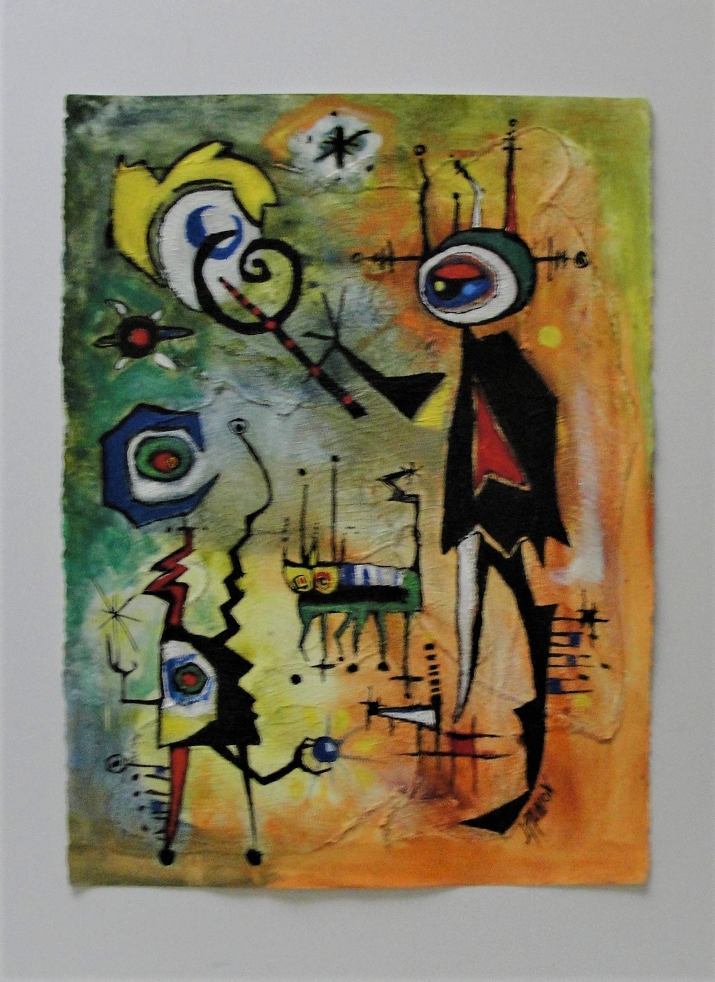 Mixed media, acrylic, and cheese cloth on 30x22, 300lb. watercolor paper, unframed.