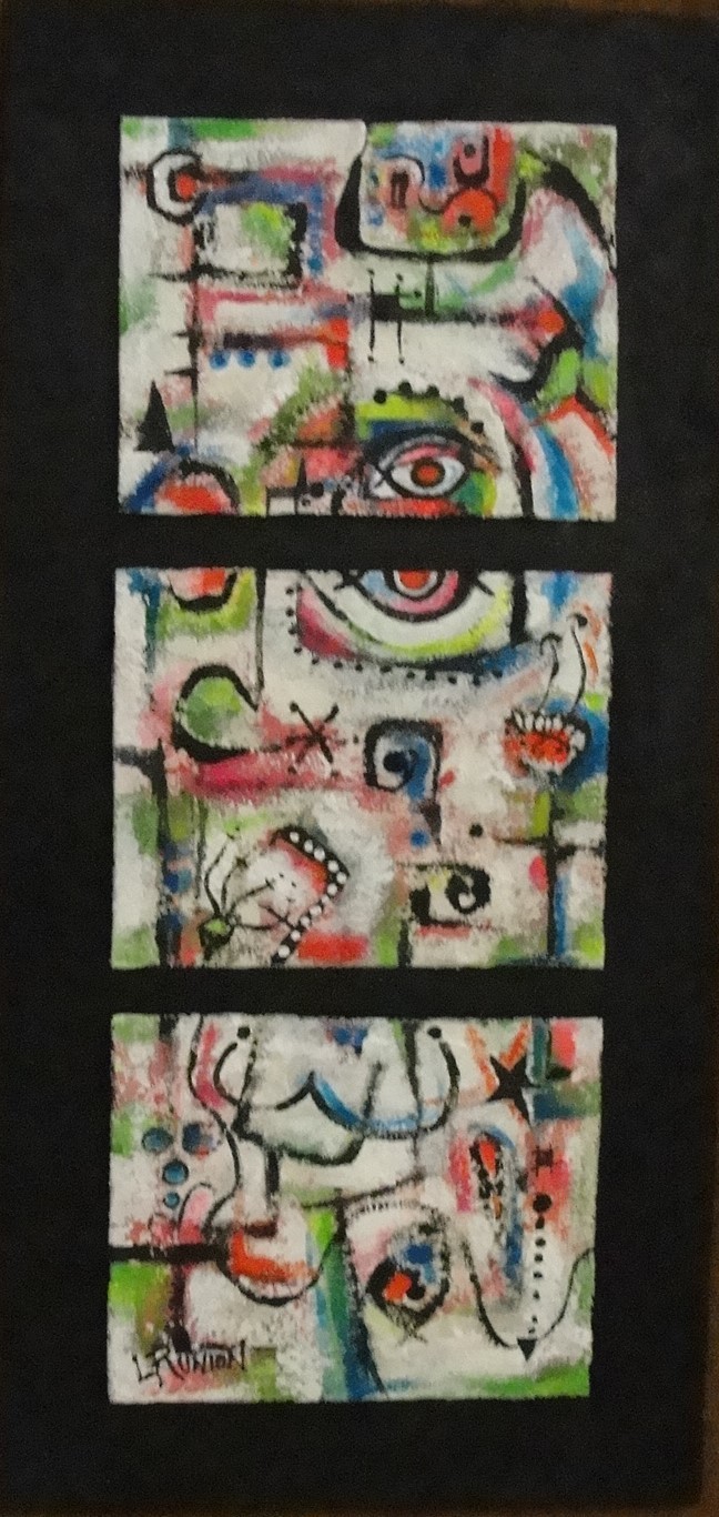 Triptych, acrylic on fabric on masonite, each image is 8x10, overall size is 15x31