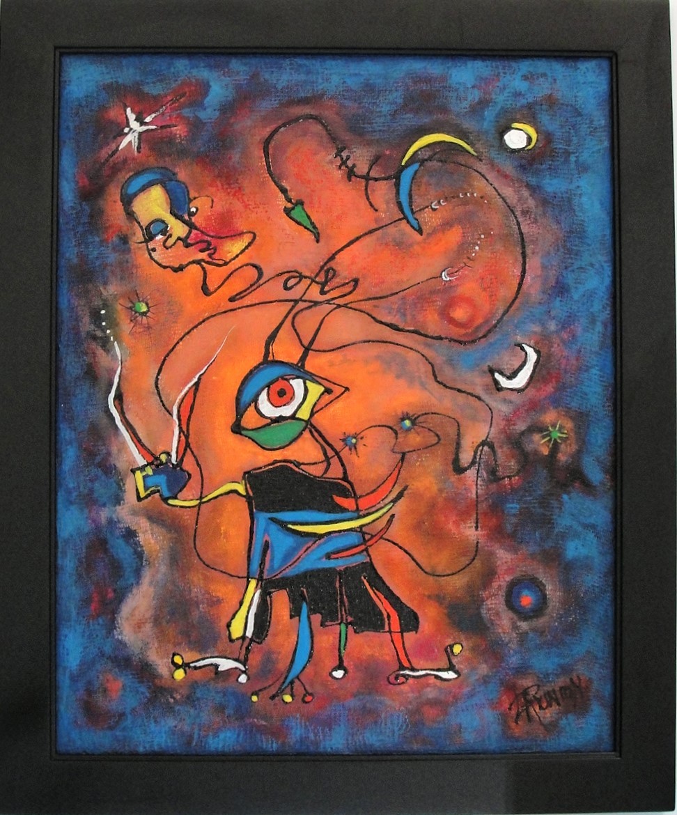 Acrylic and mixed media with cheesecloth on masonite, image 20x16 frame 23x19.