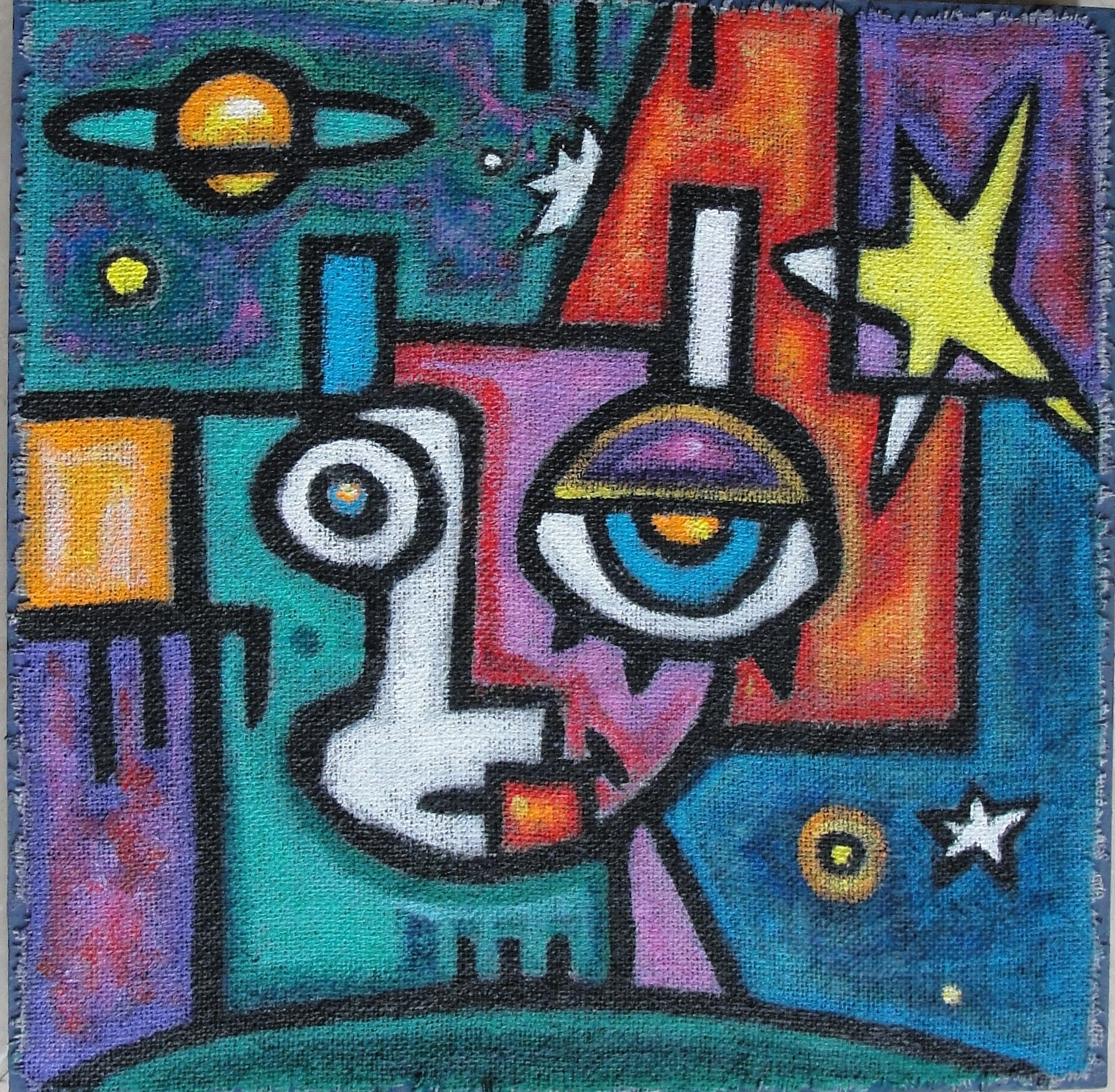 Acrylic on burlap on gallery wrapped canvas, 18x18.