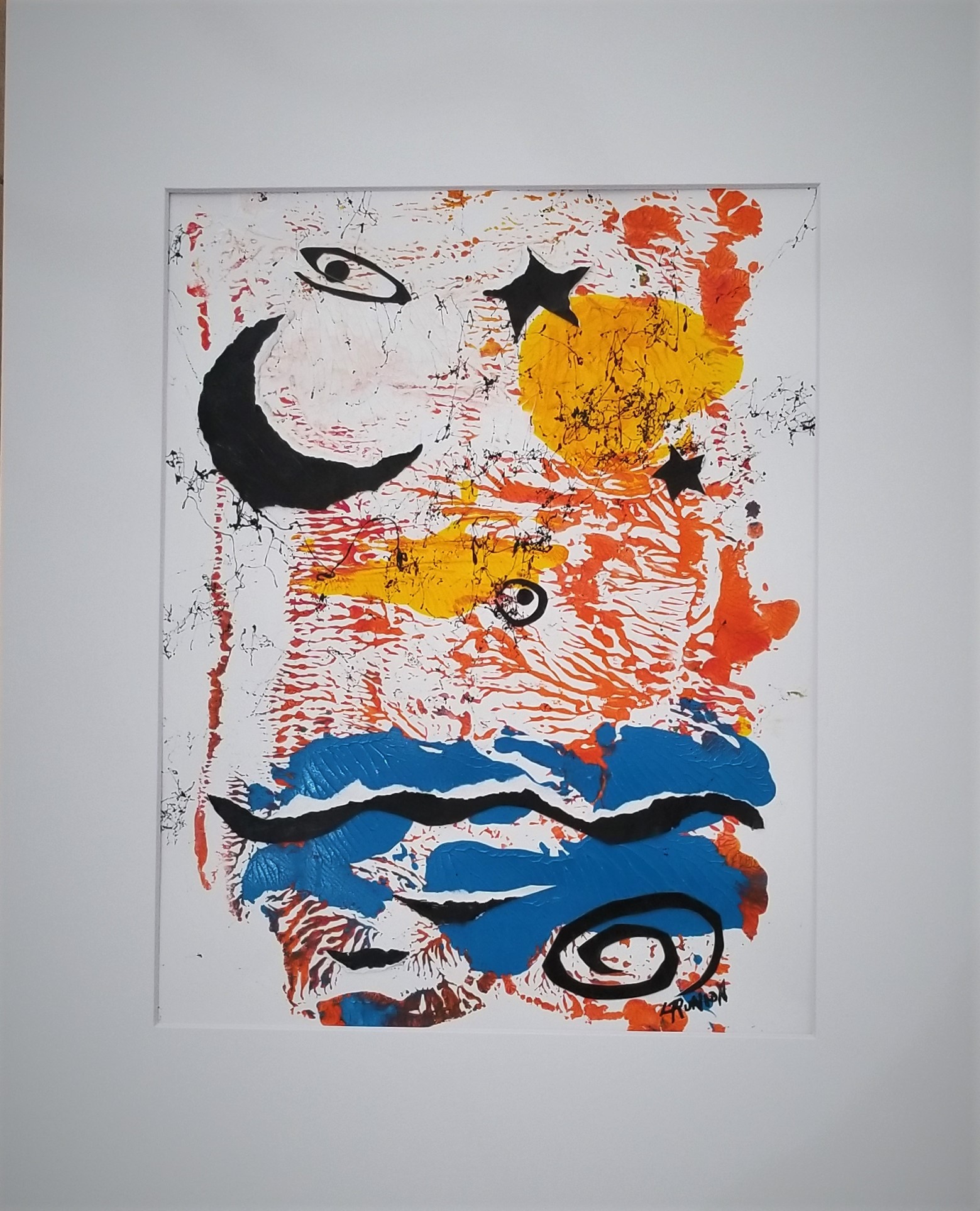 Monoprint on bristle board with mixed media, image size 14x11, with 20x16 white beveled mat.