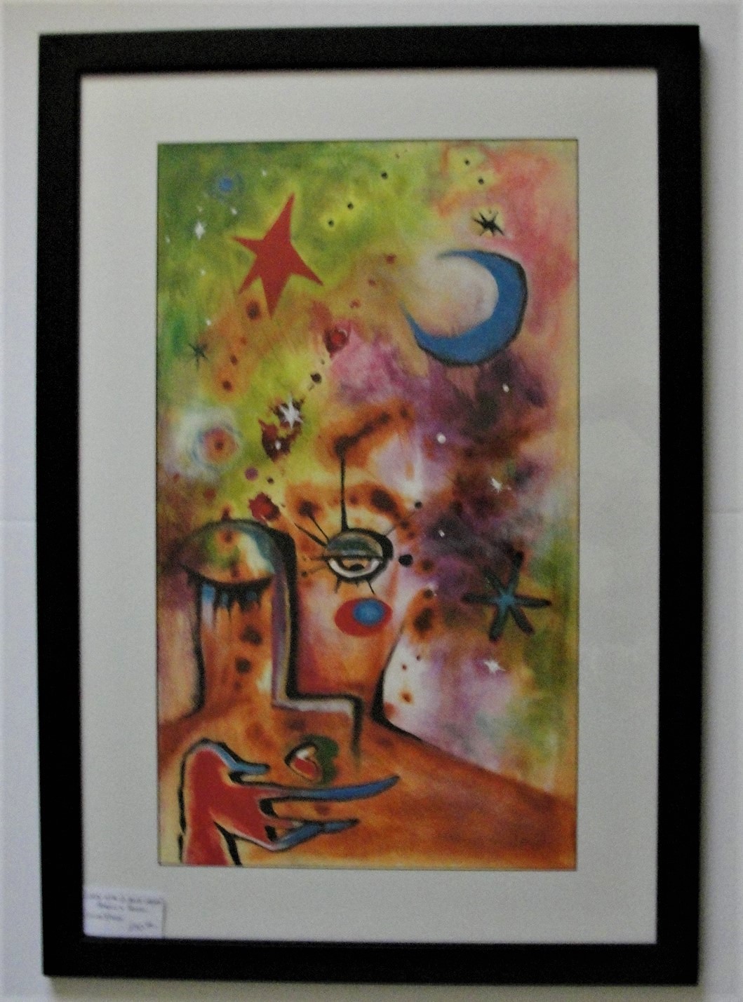 Acrylic and pastel, framed and matted under glass. Frame outside dimensions, 39"x27", image size 30"x18"