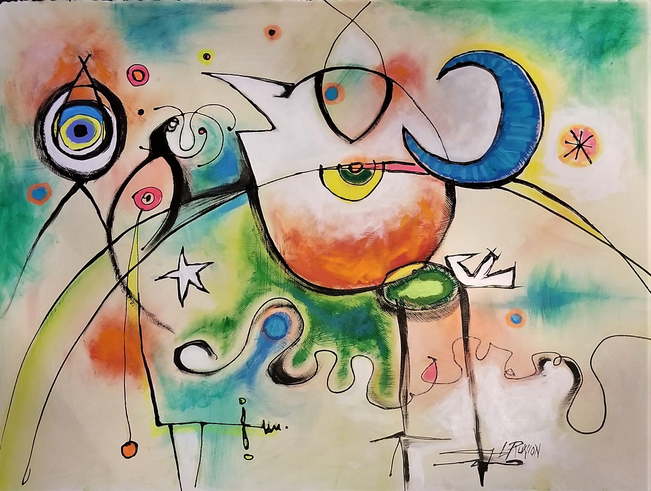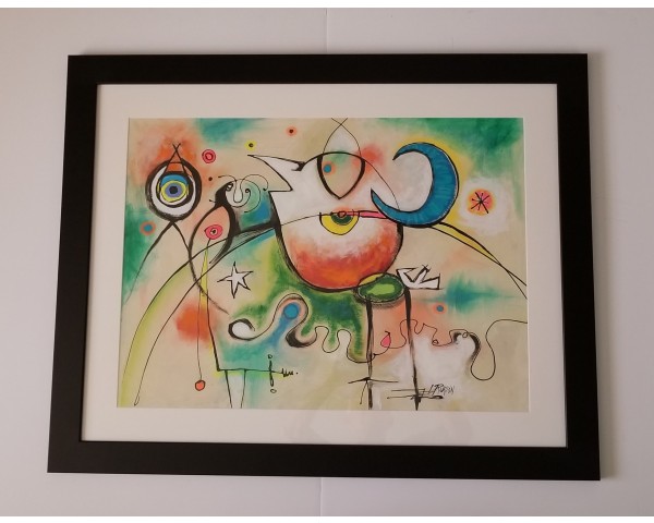 Acrylic and mixed media on watercolor paper, matted and framed. Frame 38.75x31 outside dimensions, image size 30x22.