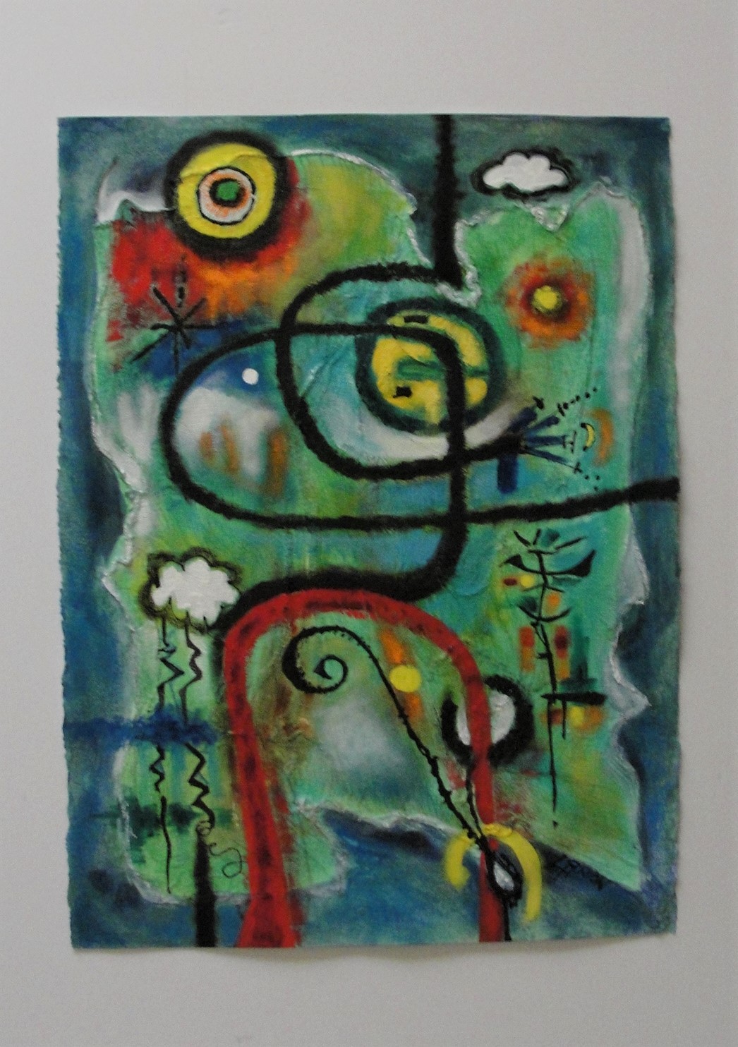 Mixed media, acrylic, and cheese cloth on 30x22, 300lb. watercolor paper, unframed.