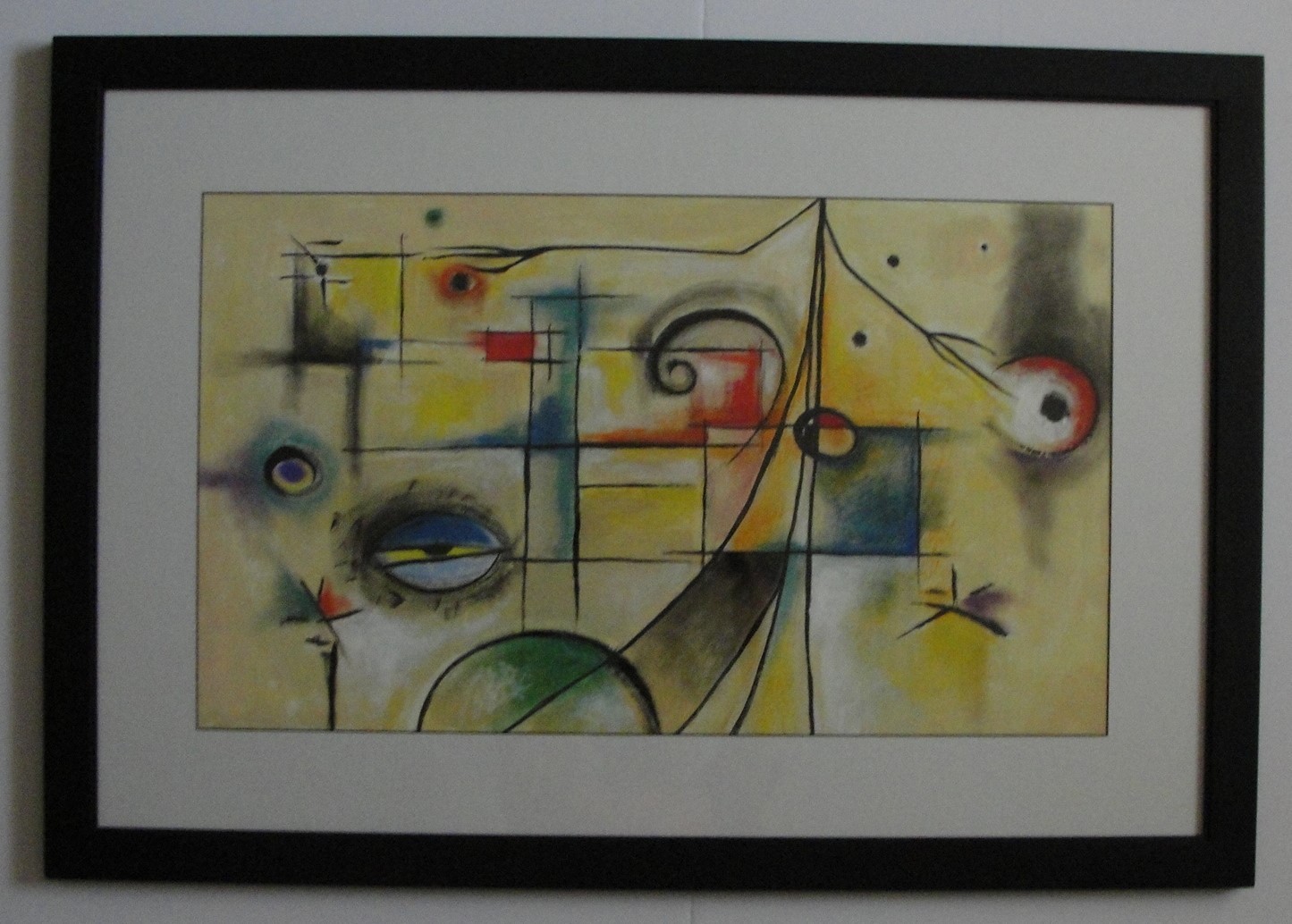 Acrylic and pastel, framed and matted under glass. Frame outside dimensions, 39"x27", image size 30"x18"